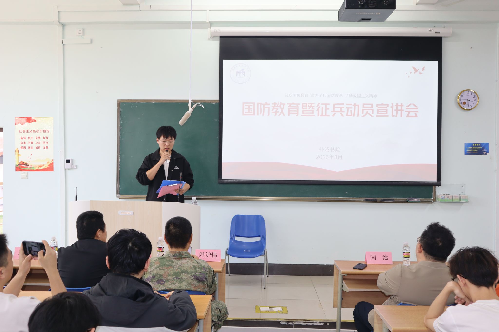 2026年3月13日下午,作为本学期“开学第一课”的一项重要内容,朴诚书院在4-214教室举办“青春献国防,建功在军营”国防教育暨征兵动员宣讲会。海口市统计局服务业科科长黄明静、海南大学人民武装部军事科科长叶沪伟作为优秀退役军官代表,应邀分别做主题分享,朴诚书院党委副书记闫治、辅导员及100余名学生代表参加宣讲会。