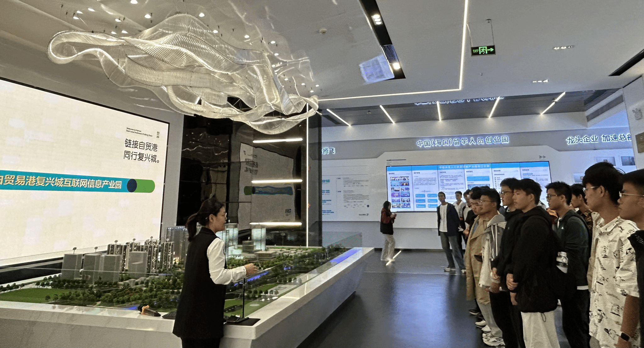 在园区城市展厅,工作人员为同学们详细介绍了园区的建设历程、核心发展规划、产业定位、特色产业布局、招商引资等情况。同时,结合海南自贸港建设的时代背景,深入分析地区发展优势,解读政策红利,让大家对海南数字经济产业的蓬勃态势和海南自由贸易港政策有了更深入的了解。