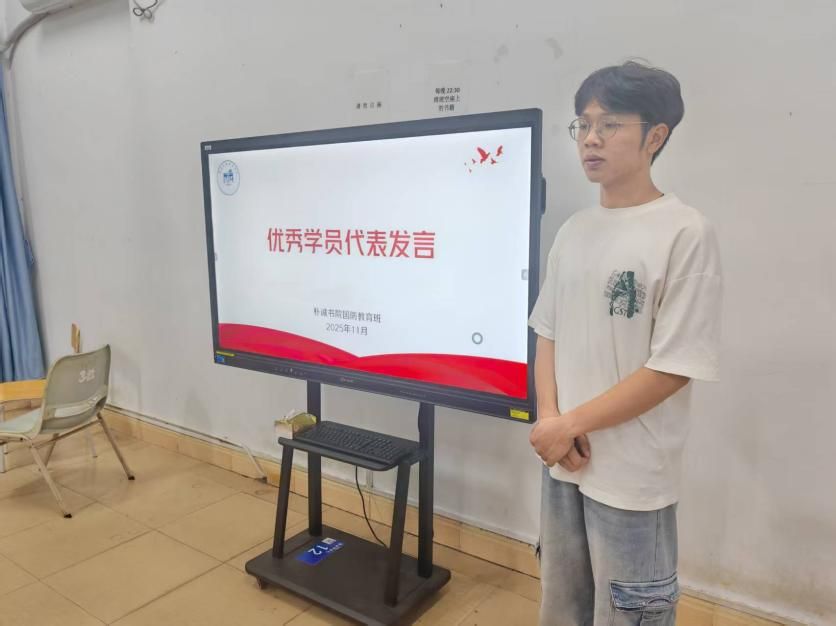 学员代表、朴诚书院A栋16班覃祖逸分享自己参与书院国防教育活动的感受,从最初对国防知识仅停留在表面的认知,到通过参与一系列丰富多样的实践活动和讲座,深刻领悟到国防对于一个国家的重要意义,也更坚定了自己投身国防的信念感和使命感。