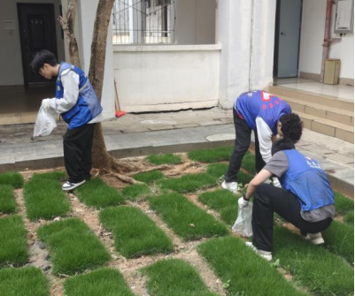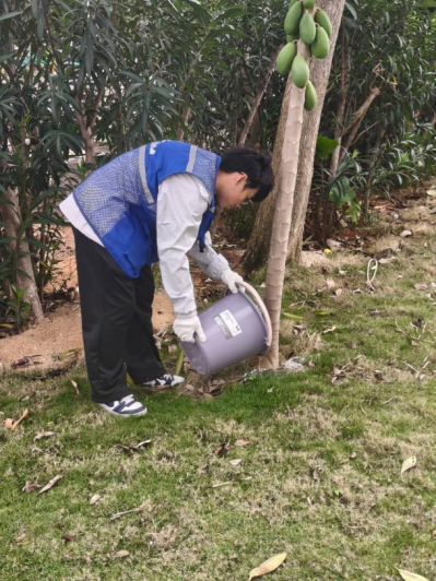 活动现场,志愿者们分组协作、各司其职,掀起护绿热潮。大家提着水桶为苗木补水浇灌,弯腰俯身清理草坪纸屑枯叶,细心扶正歪斜枝丫。汗水浸润校园土地,也在学子心底种下了爱绿护绿、守护生态的责任种子。